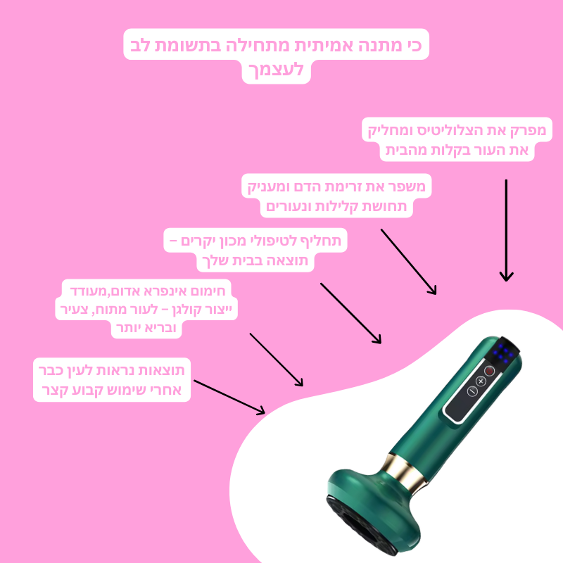 💆‍♀️ כל עוד משתמשים במכשיר לפי ההוראות, הוא בטוח לחלוטין לשימוש יומיומי על הגוף – בלי סיכון לעור או לבריאות.